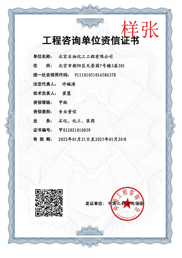 工程咨詢單位甲級資信證書(石化、化工、醫藥)