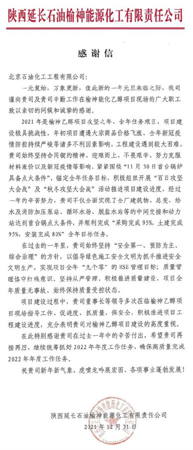 元旦前夕,北京石油化工工程有限公司先后收到延長(zhǎng)石油集團(tuán)和旗下的榆神能化公司發(fā)來(lái)的感謝信,信中對(duì)北油工程EPC總承包的50萬(wàn)噸/年煤基乙醇項(xiàng)目建設(shè)期間付出的辛勤勞動(dòng)表示感謝,并向項(xiàng)目現(xiàn)場(chǎng)廣大職工致以節(jié)日的問(wèn)候。