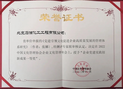 北京石油化工工程有限公司榮獲“黨建強企優秀案例一等獎”。另外,公司黨委申報的2021年度和2022年度兩篇黨建和企業文化研究成果獲獎:《黨建引領文化促進企業高質量發展的管理體系研究》榮獲“企業黨建實踐創新成果一等獎”;《國有企業加強黨的全面領導的組織化、制度化、具體化》入選“以高質量黨建引領企業高質量發展創新優秀成果”,并正式入編由人民日報出版社出版發行的《以優異成績向黨獻禮——新時代黨建與企業文化創新優秀成果選編》。