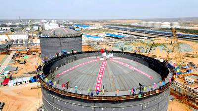 7月14日,由北京石油化工工程有限公司EPC總承包的延長石油靖邊天然氣儲氣調峰及配套LNG項目兩臺5萬立方米大型液化天然氣儲罐穹頂氣頂升作業圓滿完成,標志著外罐主體結構建設完畢,全面轉入內罐安裝階段,為項目后續建成中交奠定了堅實基礎。