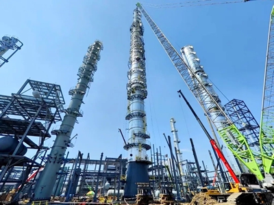 乙醇塔是本項目核心設備,直徑4.8米,高度116米,總重380噸,分4段進場組對。尤其最后吊裝的上段設備長達25米、重達126噸,吊裝難度大,精度要求高。面對場地條件受限、惡劣天氣等不利因素,項目組與各參建方精心策劃、周密部署,通過科學管理,在38天窗口期內(nèi)高效完成包括超高、超重塔器及反應器的安裝,為項目的全面推進創(chuàng)造了有利條件。