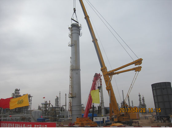 2013年4月28日早晨,隨著吊車發(fā)動機隆隆的聲響,100項目(煤-油共煉試驗示范項目)現(xiàn)場第一吊--煙囪吊裝開始作業(yè),這標(biāo)志著100項目進入了設(shè)備安裝階段。
